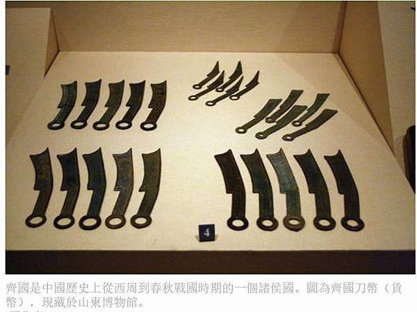 齊國是中國歷史上從西周到春秋戰國時期的一個諸侯國。圖為齊國刀幣(貨幣),現藏於山東博物館。