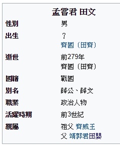 孟嘗君是戰國時齊國的貴族,被稱為戰國第一公子。姓田名文,他的父親是齊國宰相田嬰,他襲父爵封于薛國,號孟嘗君。他父親迷信五月五日出生的孩子會剋父母,而生母又非正室,所以從小就被逐出家門,辛得殷實商人「白圭」對他悉心愛護,孟嘗君才能健全地發展成一個謙遜、上進、心地善良的人。白圭是中國第一位商業理論家,是企業的鼻祖,他的經營致勝理論:「在仁義的世界裡開創事業,把所有的利益還給天下人」一直是商場奉行不渝的圭臬。孟嘗君受其影響至巨,白圭在經濟上也給與他極大的輔助。孟嘗君長大後,父親也知道了他的才能,也接受了他,以他的待人之道,天下有才之士紛紛投到他的門下,終成戰國第一公子。(與趙平原君、魏信陵君、楚春申君共稱戰國四君子)