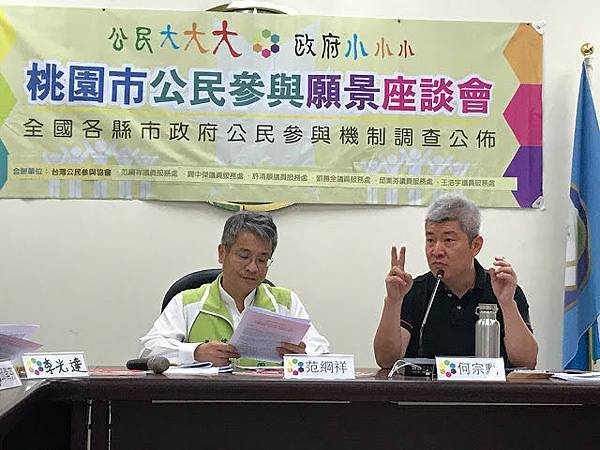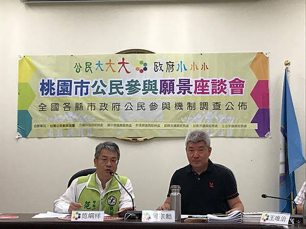 台灣公民參與協會(簡稱公民會),於5月9日假桃園市議會一樓會議室,與桃園市范綱祥閻中傑、許清順、劉勝全、邱素芬、王浩宇等議員聯合召開「桃園市公民參與議員響應記者會暨願景座談會」,並公布「全國公民參與調查報告書」草案。與會官員代表有桃園市政府研考會、青年事務局、文化局、社會局、環保局、民政局、交通局、客家事務局、勞動局、新聞處、觀光旅遊局、體育局、原住民族行政局官員代表等。