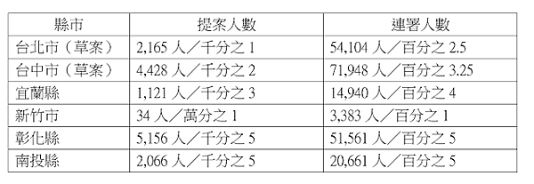 宜蘭縣則將兩項門檻下修,提案門檻從縣長選舉選舉人數千分之五以上,下修為千分之三,連署門檻則從百分之五降為百分之四。依去年宜蘭縣長選舉人數37萬3,510人計算,需要至少1,121人提案、14,940人連署。