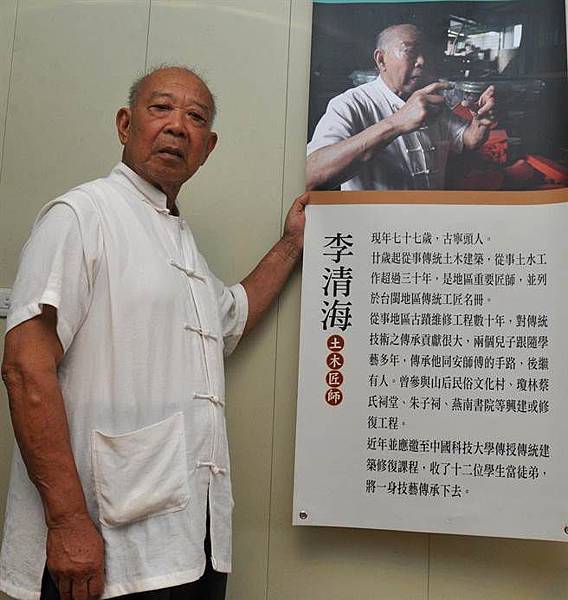 李清海,77歲,古寧頭人。20歲起從事傳統土木建築,是地區重要匠師,並列於台閩地區傳統工匠名冊。幾十年來從事地區古蹟維修工程,對傳統技術之傳承貢獻很大。曾參與山后民俗文化村、瓊林蔡氏祠堂、朱子祠、燕南書院等興建或修復工程。近年也應邀至中國科技大學傳授傳統建築修復課程。