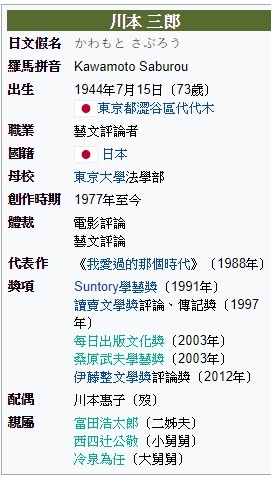 川本三郎(日語:川本 三郎,1944年7月15日-)是日本藝文評論者,也是讀賣文學獎和Suntory學藝獎社會風俗類作品評審。川本曾任朝日新聞社記者,任職《朝日雜誌》編輯部期間,曾採訪朝霞自衛官命案兇手「K」,為其藏匿證物,事後又委託他人燒毀證物,審訊期間一度基於新聞倫理堅持為兇手「K」保密,因而被判有期徒刑十個月、緩刑兩年,是日本媒體史上著名的倫理案件[1]。被朝日新聞社免職後,川本成為自由文字工作者,寫下當年的記者生涯,於1986年至1987年間在雜誌《SWITCH》的「The Reading」專欄上發表,引發日本輿論熱議。