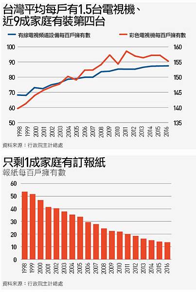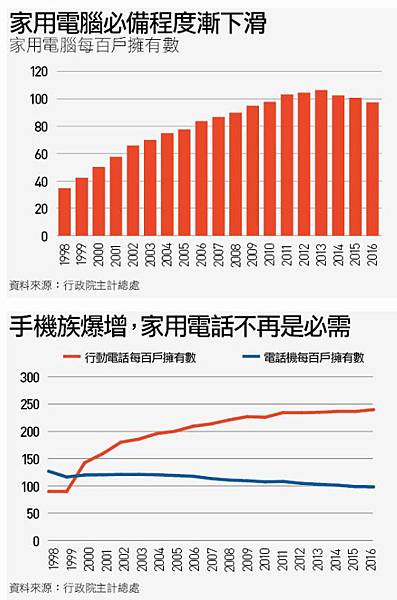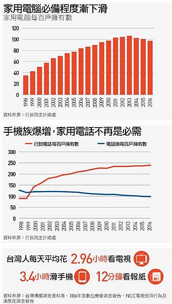 每天早晨,邊看報紙邊吃早餐,朋友打電話來煲電話煲了一個下午,晚上全家飯後娛樂就是一起看電視。這些場景到了現在,有哪些已經很難在台灣家庭看到了呢?《天下》分析家庭收支調查發現,台灣家庭仍愛看電視,但幾乎不看報;手機更侵蝕了家用電話、甚至電腦市場。