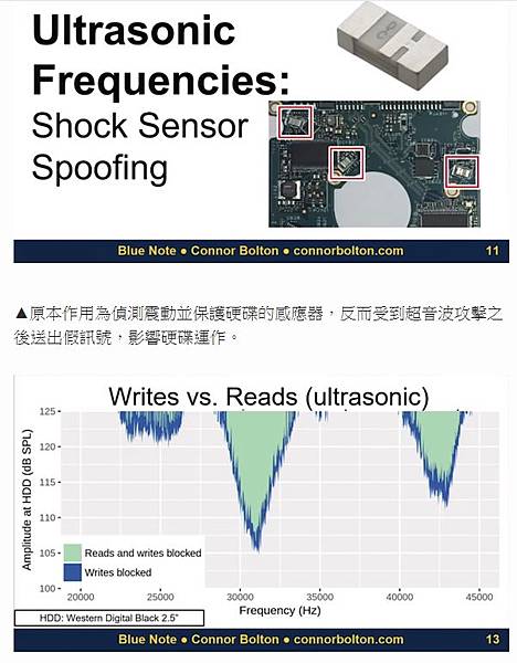 ▲超音波攻擊對於硬碟讀寫作業均有成效,相對於人耳聽得見的頻率只是將讀寫頭定位偏離,有機會進行偏移容忍度較高的讀取作業,震動感應器送出假訊號讓控制晶片移出讀寫頭,就完全無法獲取碟片儲存的資料。