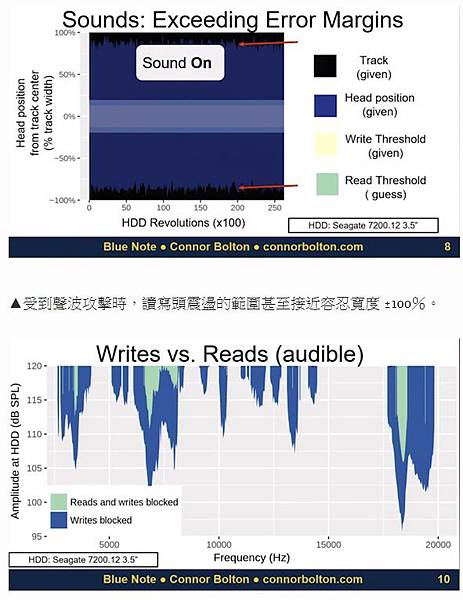 ▲受到聲波攻擊時,讀寫頭震盪的範圍甚至接近容忍寬度 ±100%。