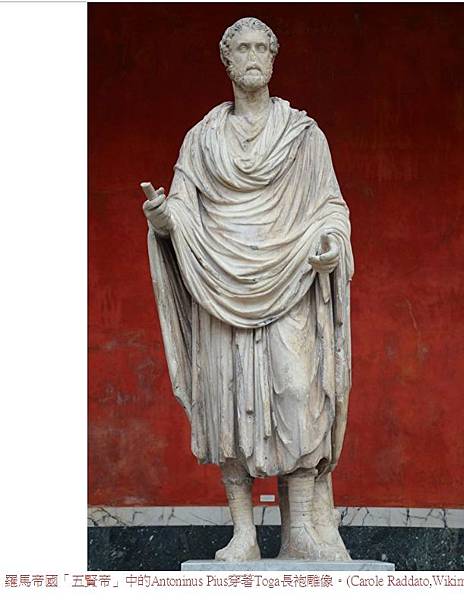 羅馬帝國「五賢帝」中的Antoninus Pius穿著Toga長袍雕像。(Carole Raddato,Wikimedia Commons)