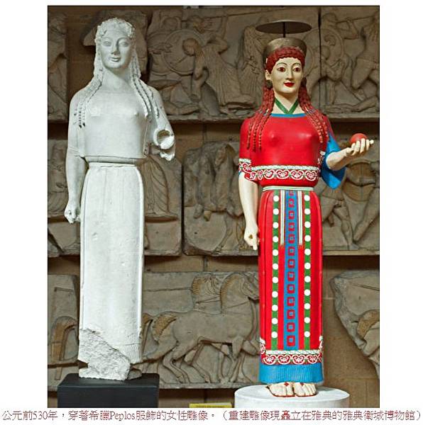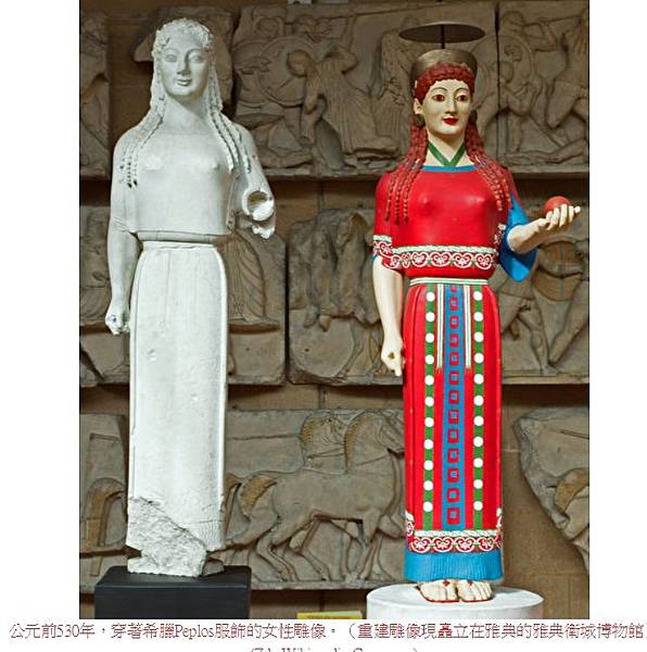 公元前530年,穿著希臘Peplos服飾的女性雕像。(重建雕像現矗立在雅典的雅典衛城博物館)(Zde,Wikimedia Commons)