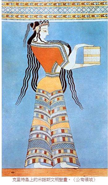 現在的考古研究認為,在克里特島上出現的米諾斯文化(Minos)是地中海地區中最早綻放的花朵,根據出土文物推測,其興盛的年代大約介於西元前3000年1100年之間。從宮殿壁畫來看,男性大多穿著圍腰裙,女性的上衣為短袖緊身衣,搭配具有層次感的鐘形裙,男女皆用金屬腰環及寬皮帶束緊腰部。米諾斯人的穿著與文字與後來興起的其他城邦皆不相同,因此也有學者將米諾斯文明獨立於古希臘文明之外。