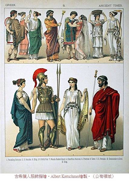 古希臘人服飾描繪。Albert Kretschmer繪製。(公有領域)