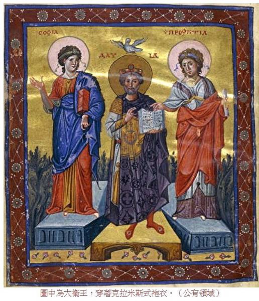 圖中為大衛王,穿著克拉米斯式袍衣。(公有領域)