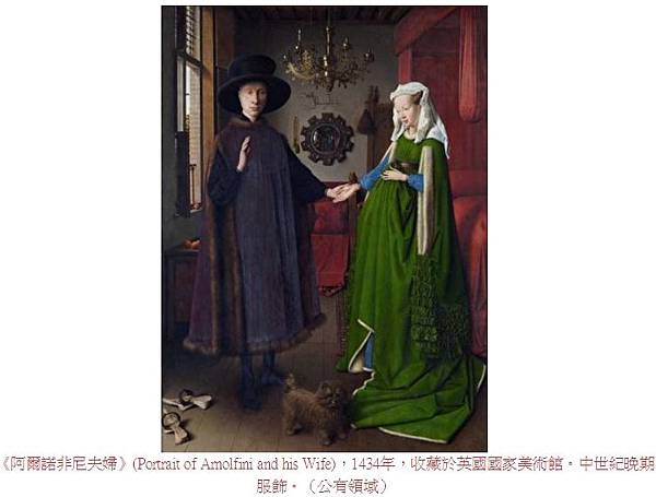 《阿爾諾非尼夫婦》(Portrait of Arnolfini and his Wife),1434年,收藏於英國國家美術館。中世紀晚期服飾。(公有領域)