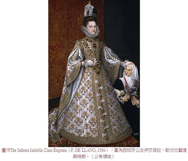 畫作The Infanta Isabella Clara Eugenia(F. DE LLANO, 1584),圖為西班牙公主伊莎貝拉,歐洲文藝復興時期。(公有領域)