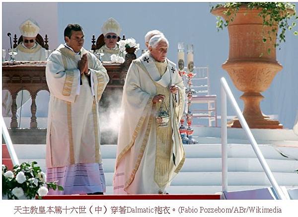 天主教皇本篤十六世(中)穿著Dalmatic袍衣。(Fabio Pozzebom/ABr/Wikimedia Commons)