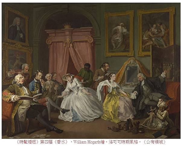 《時髦婚姻》第四幅《香水》,William Hogarth繪。洛可可時期風格。(公有領域)