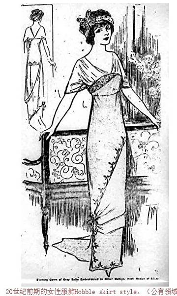 20世紀前期的女性服飾Hobble skirt style。(公有領域)