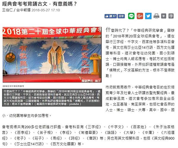 什麼時代了?「中華經典研究學會」舉辦的「2018年第20屆全球經典會考」,還在舉行三字經、千字文、百家姓等多項科目會考,英文也有莎士比亞14行詩、西方文化導讀等科目,這次會考從幼兒園、國小到碩士、博士均有人報名應考,考試方式包括背誦、口頭接龍等,外界批評這種背誦會考是「填鴨式」不求甚解的方法,根本不值得鼓勵!