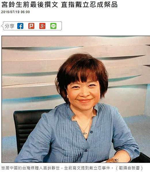 近年移居中國北京的台灣媒體人宮鈴於17日過世,15日她在臉書撰文寫道自己在中國的一些經歷,也談到「戴立忍事件」;她直指戴是「祭品」,發再多聲明都無濟於事。她寫道:「在中國沒有一件事與政治無關」、「對他們而言,我們是『非我族類,其心必異』。我相信,未來四年還會有許多的戴立忍,簡單粗暴,就是他們的策略。」宮鈴生前最後撰文 直指戴立忍成祭品 -大陸網友口中的“台獨”份子,其實在台灣是個典型外省人二代,父親祖籍在安徽省,母親是北京人,因此從小對於中國大陸一直有特殊的情懷。 https://goo.gl/ZJG8za