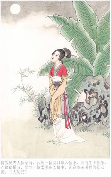 傳說吳夫人懷孕時,曾夢到一輪明月進入懷中,既而生下孫策。而懷孫權時,又夢到一輪太陽進入懷中。