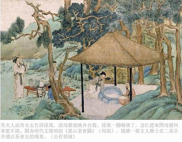 吳夫人派侍女去告訴孫策,說母親要跳井自殺。孫策一聽嚇壞了,急忙趕來問母親何事想不開。圖為明代文徵明的《惠山茶會圖》(局部),描繪一群文人雅士在二泉亭井邊以茶會友的場景。(公有領域)
