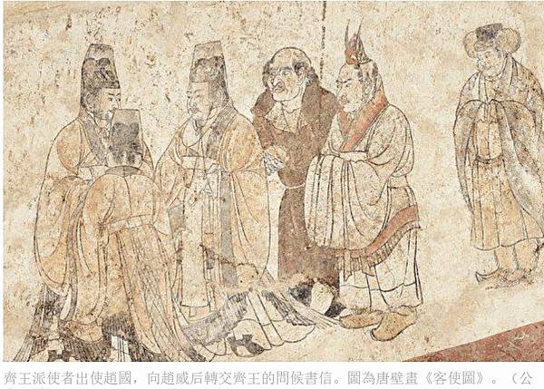 齊王派使者出使趙國,向趙威后轉交齊王的問候書信。圖為唐壁畫《客使圖》。(公有領域)