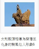 其實 ,民間一般管這位老人叫騎鳳仙人,而關於騎鳳仙人的由來, 從古至今有著很多的說法,其中流傳最廣, 可信度最高的就屬戰國的齊湣王了。傳說, 齊湣王在位時窮兵黷武, 一門心思就想攻占各國。結果招來其他國家的集體討伐 ,兵敗跑路,一路向西逃竄到了渭水, 河水湍急無法渡河 ,前有大河 ,後又追兵 ,齊湣王已經無路可走了 ,正要拔劍自盡。突然 天上飛來一隻巨大的鳳凰 ,馱著齊湣王, 就渡河而去了。後來的皇帝們就把齊湣王騎鳳而走的故事 ,雕在了自個的屋檐上 ,希望自己在遇到危險的時候, 也能像齊湣王一樣逢凶化吉, 遇難呈祥呢!