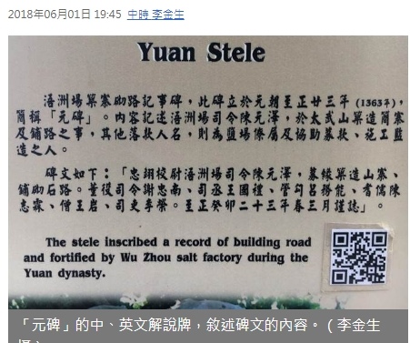 「元碑」的中、英文解說牌,敘述碑文的內容。(李金生攝)