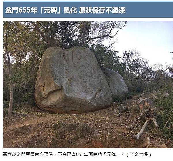 矗立於金門蔡厝古道頂端,至今已有655年歷史的「元碑」。(李金生攝)
