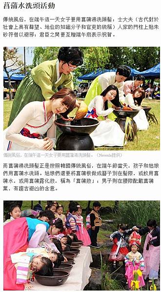 而菖蒲湯洗頭髮正是按照韓國傳統風俗,在端午節當天,孩子和姑娘們用菖蒲水洗頭。姑娘們還要將菖蒲根做成簪子別在髮際,或飲用菖蒲水,或用菖蒲露化妝,稱為「菖蒲妝」;男子則在腰際配戴菖蒲葉,有趨吉避凶的含意。