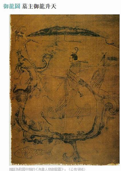 戰國時代的墓葬品中有「御龍圖」,宛然是龍舟的原形。看這張寶貴的出土古畫《帛畫人物御龍圖》,豈不像活生生的「龍舟畫」?圖中有一戴著高冠著長袍的男子,腰佩長劍,手執韁繩,駕馭著一飛龍。龍旁有一鯉魚。看龍身平伏又蜿蜒,龍爪在兩翼,龍的頭部高揚,似在水中衝風揚波,龍尾高翹、尾端卷曲。整條龍呈現舟子形狀,這畫宛然是龍舟的原形。