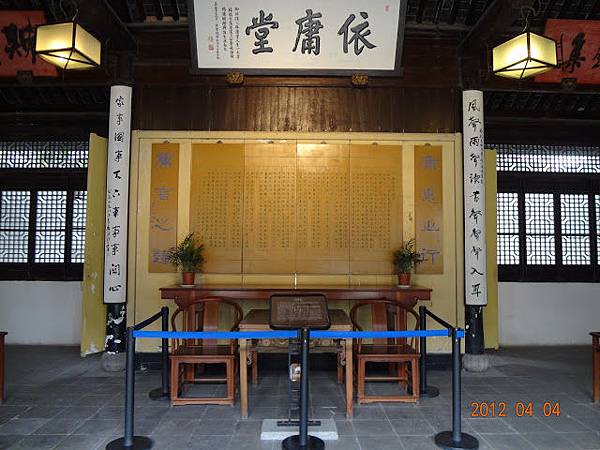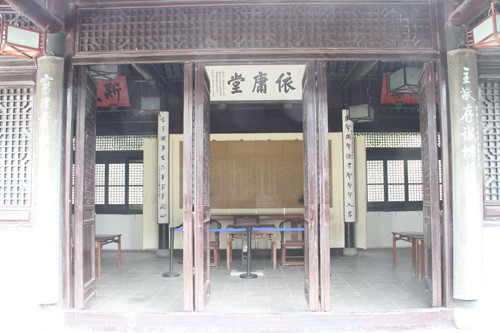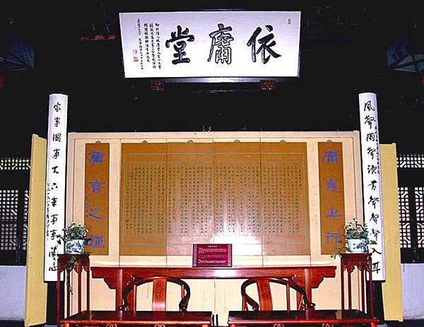 鄧拓受迫害含冤而死,原先的對聯在浩劫中被毀。現在掛在依庸堂內的,是由著名作家、雜文家、 「三家村」唯一的倖存者廖沫沙1982年手書。