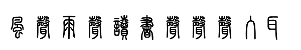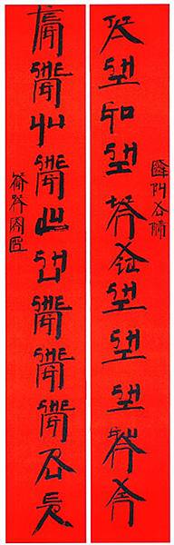 徐冰後來在美國還發明了可以識讀的方塊英文,把拉丁字母變得像中國的偏旁,按照中國的造字方法組合成方塊形,而且可以念出來。徐冰後來又書寫了一副方塊漢語拼音的對聯,內容是“風聲雨聲讀書聲聲聲入耳,家事國事天下事事事關心”。(圖11)所以,文字遊戲的傳統還在續寫著當代的篇章。