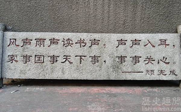 「風聲雨聲讀書聲聲聲入耳,家事國事天下事事事關心。」是東林志士讀書講學而不忘國家安危的真實寫照,同時也激勵我們後來的學子要為了國家的繁榮昌盛不懈努力。