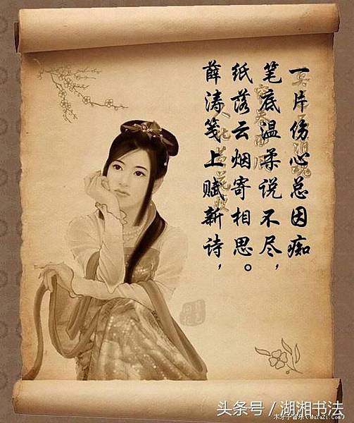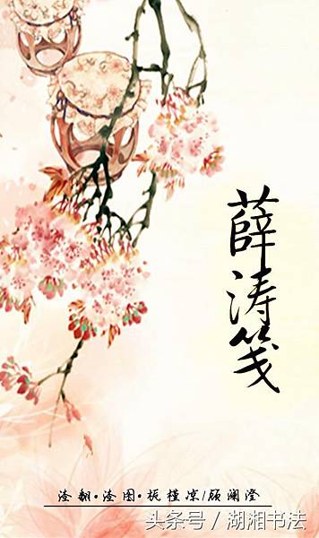 薛濤,其父為宮廷樂官,安史之亂入蜀逃避戰禍,定居成都。薛濤幼年喪父,生活無著,16歲成為官妓。在一次酒宴中,薛濤因才情被出任劍南西川節度使的中書令韋皋所賞識,一時聲名鵲起。隨著接觸的增多,韋皋提攜她做「女校書」(相當於今天的女秘書),讓她參與一些案牘工作。40多歲的韋皋韋大人對當年才15歲的「小才女」備加重用後「仍然感覺大材小用」,有一天突發奇想,要向朝廷打報告,為薛濤申請作「校書郎」,被手下再三勸阻,而後不了了之(呵呵)。