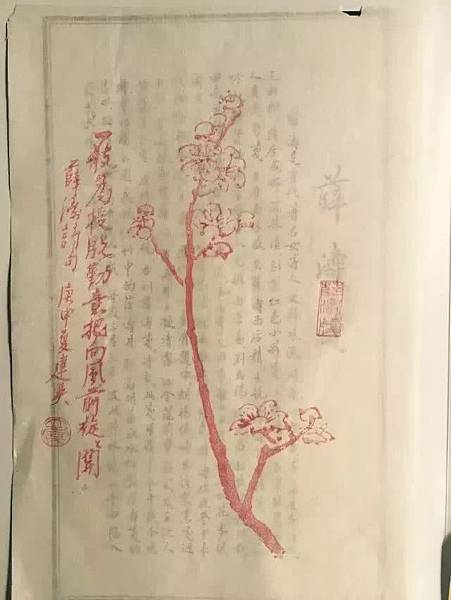……以浣花潭水造紙故佳,其亦水之宜也。」從這些記載中可知,「薛濤箋」的形制是紅色小幅詩箋,九世紀初造於成都郊外浣花溪的百花潭。這種紅色小箋曾被薛濤用以寫詩與元稹、白居易、杜牧、劉禹錫等人相唱和,因而名著於文壇,乃濤設計「命匠人狹小為之」。