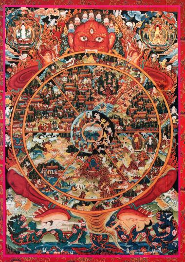 這幅圖原本由釋迦牟尼佛所畫,描繪出輪迴或「循環存在」的種種境況,以及居於其中的眾生。他們全都在死主的魔掌之中,提醒我們記起無常。