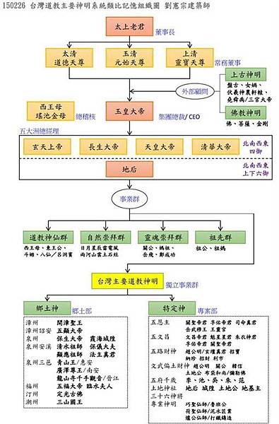 台灣道教神明系統圖/中國道教神明系統圖/中華道教神明溯源系統表/道教主要神明的關係和位階以企業系統類比,畫出了祂們之間的關係圖,例如太上老君是董事長、三天尊是常務董事,玉皇大帝則是 CEO @ 姜朝鳳宗族 :: 痞客邦 :: http://bit.ly/2JrdyCi