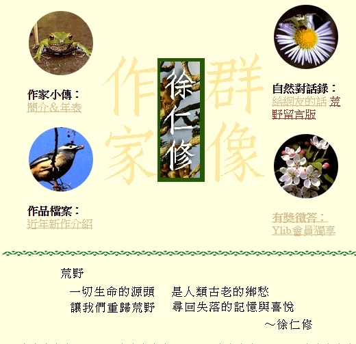 在第一線擔任自然教育布道者,徐仁修的「扮相」可不是聲嘶力竭控訴破壞的抗爭者,而是以傳遞自然之美的攝影家、作家的感性亮相。雖然,台灣第一篇生態浩劫的評論文章出自於他,發表於1974年《中央日報》副刊的〈失去的地平線〉,用他親眼所見控訴森林被濫墾濫伐的崩毀,但他卻沒有繼續走上控訴之路。