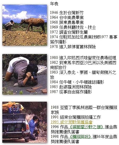1946年生於新竹,在芎林鄉下度過與大自然親密的童年生活。及長,向台灣的高山深谷深進,也向世界探險旅行,留下許多記錄。在60年代,台灣大自然開始受嚴重破壞時,率先發起保護大自然生態的呼籲,著手拍攝與記錄台灣大自然的原。同時,也從事自然教育,寫文章、出書,演講、開展覽,帶學生與孩子做自然觀與體驗。1995年發起成立荒野保護協會,匯聚更多力量來保護大自然。