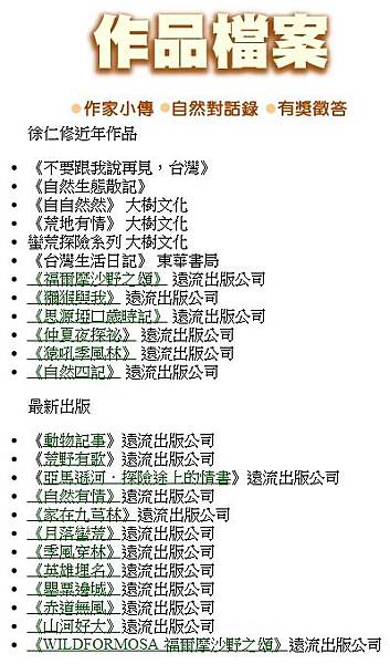 《自自然然》、《荒地有情》、《守護家園》、《邊陲東部》、《思源啞口歲時記》、《猿吼季風林》、《仲夏夜探秘》、《動物紀事》、《自然四記》、《自然生態散記》、《台灣生活日記》、《台灣的森林》、《養蜂人家》、《森林四季》、《荒野有情》、《叢林夜雨》、《家在九芎林》、《與大自然捉迷藏》、《不要跟我說再見.台灣》、《褔爾摩沙.野之頌》