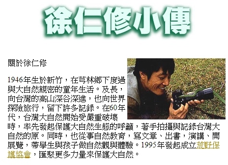 徐仁修在菲律賓、西爪哇、東馬來西亞沙巴、美國西南部、泰北、寮國與緬甸等地攝影旅行。1984年曾任牛頓雜誌的攝影師。1995年6月25日在台灣成立了荒野保護協會,以籌款購買荒地保留其生態和物種為宗旨。 https://youtu.be/xJVYA_37KAg