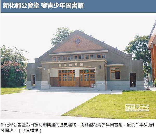 新化郡公會堂為日據時期興建的歷史建物,台南市政府投入2500萬元進行修復工程,恢復造型立面和門廊,將轉型為青少年圖書館,最快今年8月對外開放,讓歷史建築重新活化再利用。