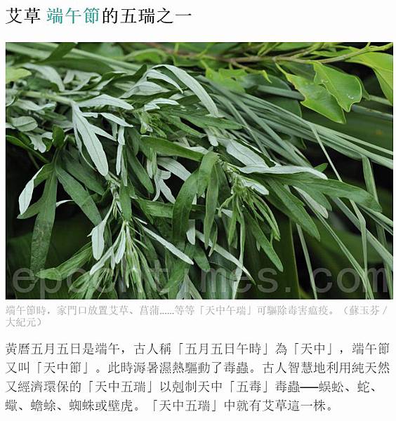 黃曆五月五日是端午,古人稱「五月五日午時」為「天中」,端午節又叫「天中節」。此時溽暑濕熱驅動了毒蟲。古人智慧地利用純天然又經濟環保的「天中五瑞」以剋制天中「五毒」毒蟲──蜈蚣、蛇、蠍、蟾蜍、蜘蛛或壁虎。「天中五瑞」中就有艾草這一株。