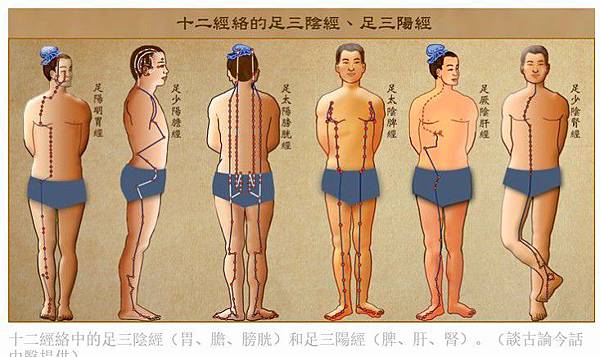 十二經絡中的足三陰經(胃、膽、膀胱)和足三陽經(脾、肝、腎)。(談古論今話中醫提供)