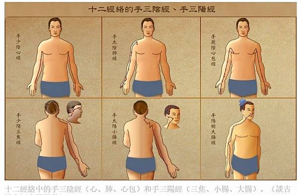 十二經絡中的手三陰經(心、肺、心包)和手三陽經(三焦、小腸、大腸)。(談古論今話中醫提供)