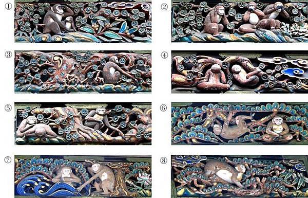 過了表門就是「神厩舎」,即是侍奉神明的御神馬所在的馬廄。當時徳川家康在關原之戰時坐騎是第一代神馬,至今仍能看到白馬。因為相傳猴子能治療馬的疾病,所以將猴子作為馬的守護神雕刻在神厩舎上。牆上有8幅猴子雕刻,描繪著人的一生,寄喻人生之道。當中最著名的是摀住眼睛、耳朵和嘴巴的三猿,出自論語的君子非禮勿言、非禮勿視和非禮勿聽,告誡兒童不要做壞事。陽明門