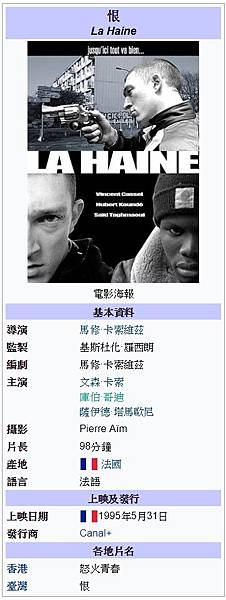 1995年坎城影展最佳導演獎,法國導演馬修卡索維茲(Mathieu Kassovitz)叛逆三部曲 (牛奶巧克力/恨/接班人)中的第二部