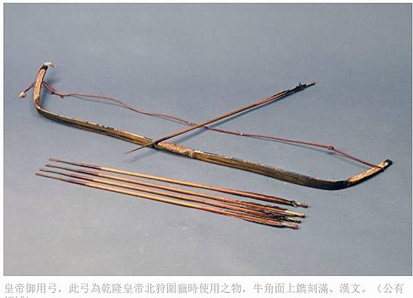 皇帝御用弓,此弓為乾隆皇帝北狩圍獵時使用之物,牛角面上鐫刻滿、漢文。(公有領域)