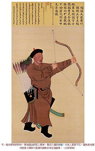 弓,看似尋常的物件,背後蘊含的匠人精神,傳承久遠的技藝,令後人歎服不已。圖為紫光閣功臣像之領隊大臣肅州鎮總兵官五福畫像。(公有領域)