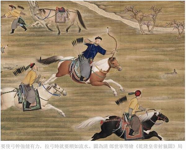 要使弓幹強健有力,拉弓時就要順如流水。圖為清 郎世寧等繪《乾隆皇帝射獵圖》局部。(公有領域)