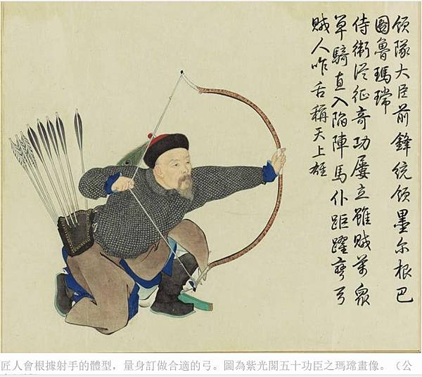 匠人會根據射手的體型,量身訂做合適的弓。圖為紫光閣五十功臣之瑪瑺畫像。(公有領域)